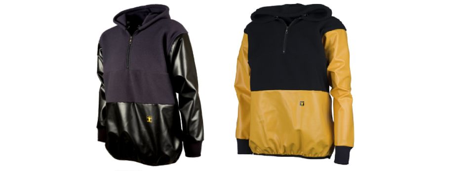 Le pull Sotra réunit la chaleur du polaire sur le corps et l’étanchéité du PVC (Cap Coz) sur les bras et la partie ventrale.