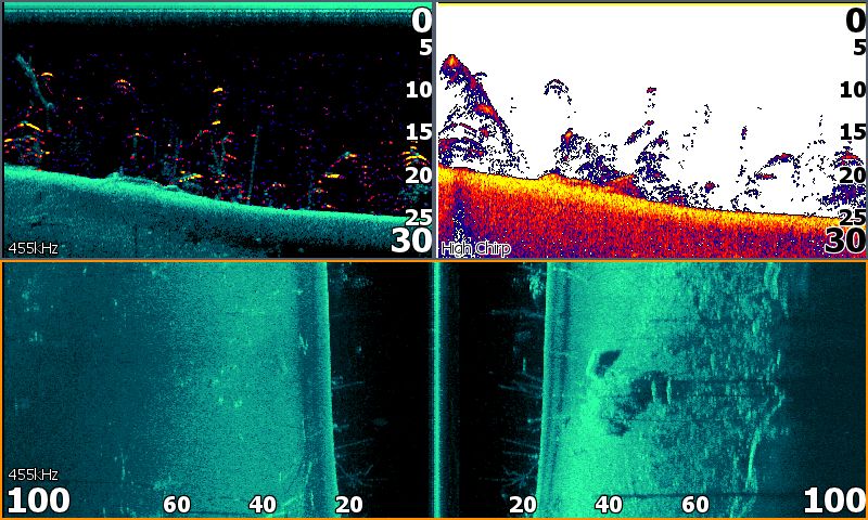 SideScan : Vue sondeur latérale permettant de « scanner le fond » et renvoyer une image photographique de ce dernier. Au même titre que pour la vue DownScan, cette fonction travaille sur les hautes fréquences (455kHz et 800kHz). Les personnalisations de ce mode sont les mêmes que pour le DownScan, à savoir les contrastes, palettes de couleur, échelle etc…